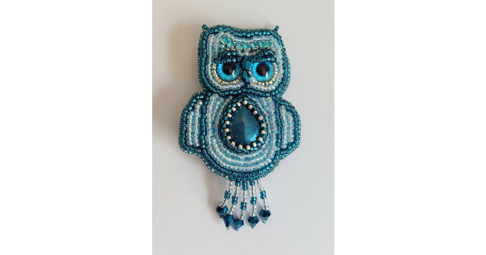 Bead Embroidered Owl Brooch: Blue Hematite, Crystal Bird Pin