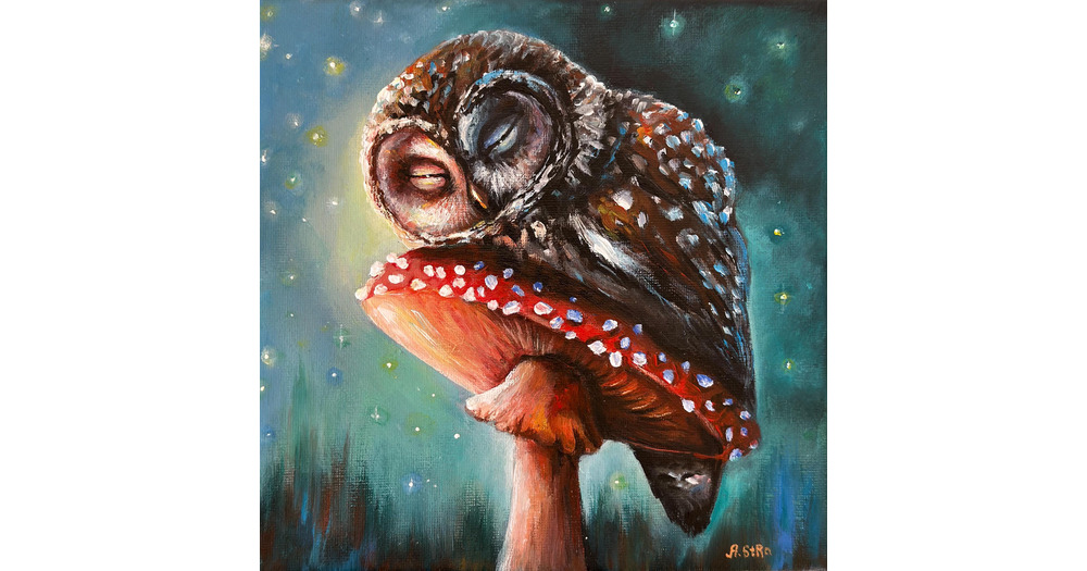 MADE-TO-ORDER Original canvas painting Sleeping Owl, Owl wall decor, Mushroom painting, Woodland ani