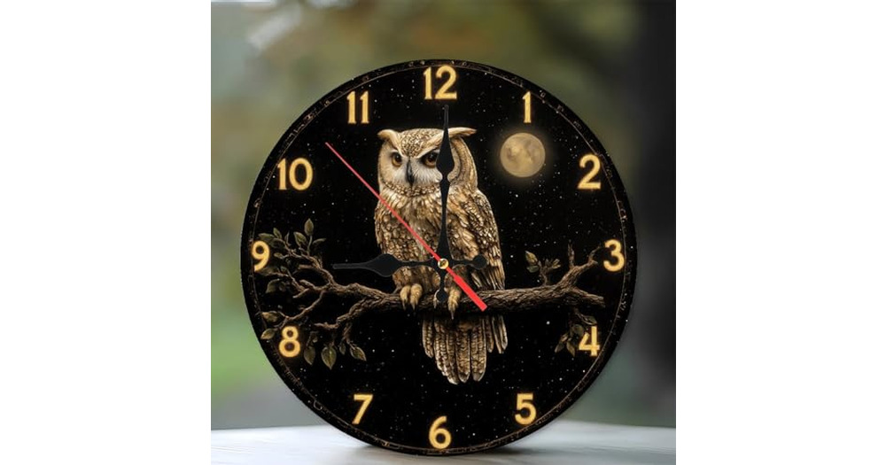 SEMARY 10-Inch Silent Wooden Wall Clock, Owl Clock Moon Night Branch Celestial ” Silent Non-Ti