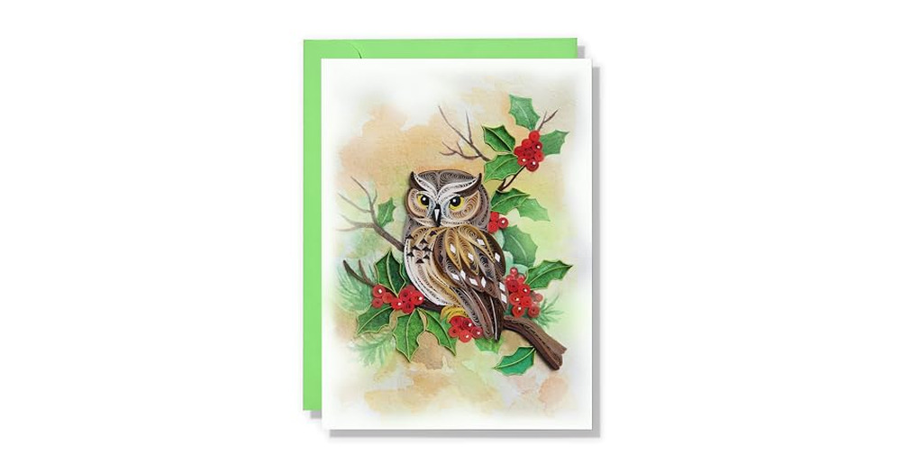 QUILLCRAFT Holly and Owl Greeting Card, Animals Quilled Quilling Birth Month Born in December, Birth