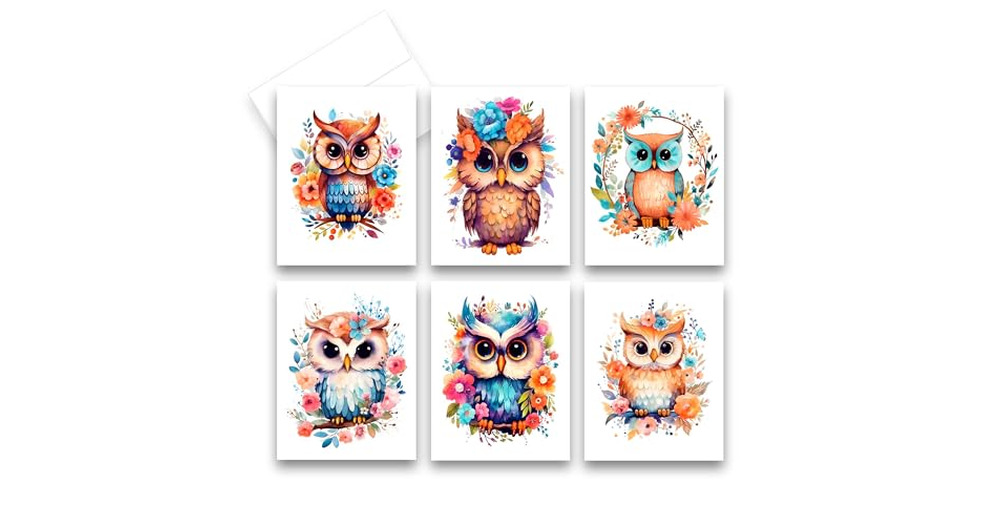 Greeting Card Assortment set of 12, Owl noteards, Assorted Cards, Folded notecards, Just because car