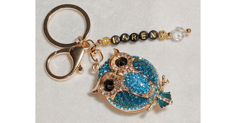 Aqua Blue Rhinestone Owl Keychain: Personalized Name Keyring