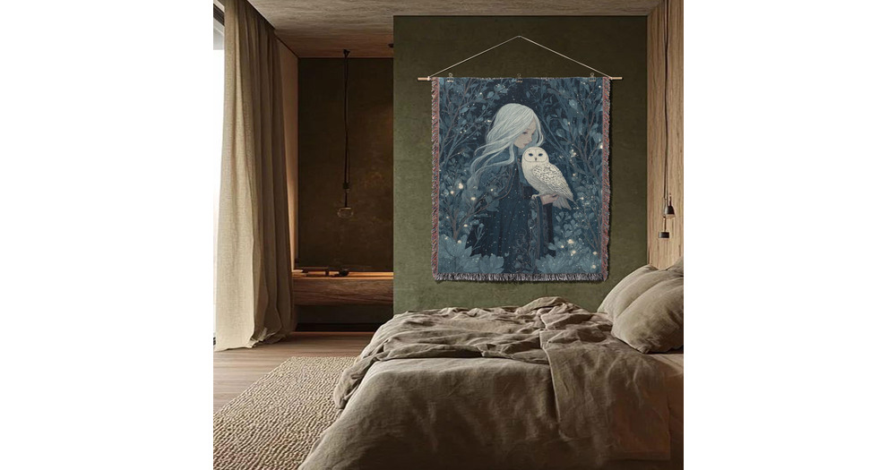 Magical Forest Girl & Owl 100% Cotton Woven Blanket, Enchanted Snowy Owl Tapestry Throw, Fantasy