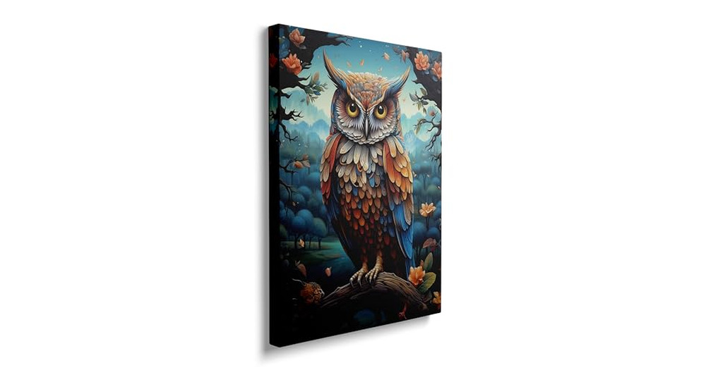Framed Color Owl On A Branch Canvas Wall Art Funny Animal And Forest Tree Landscape Decor Poster For