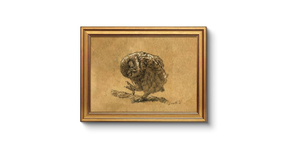 Vintage Owl Drawing Gold Framed Wall Art 12x16, Neutral Brown Sepia Animal Sketch Canvas Print, Clas