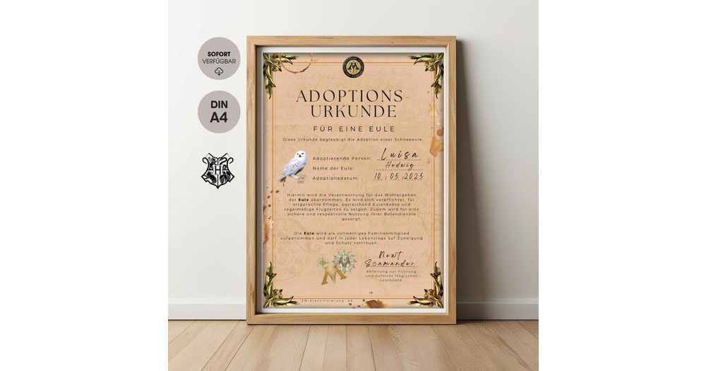 Adoptionsurkunde | Eule – Magisches Zertifikat zum Ausdrucken | Fantastische Tierwesen Urkunde
