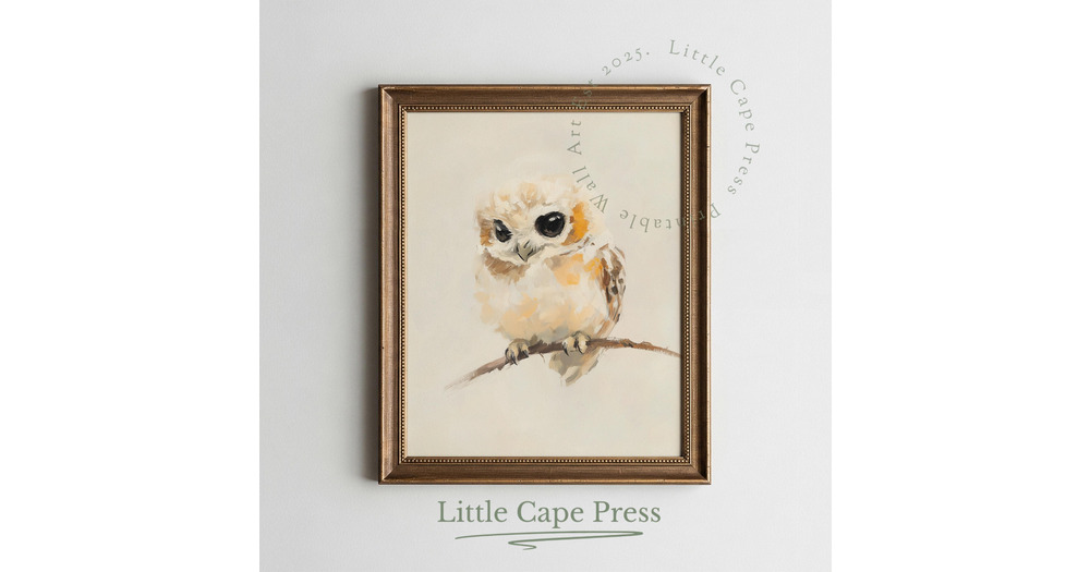 Printable Baby Owl in Woodland Scene - Neutral Nursery Wall Art, Cozy Gouache Painting, Cute Animal