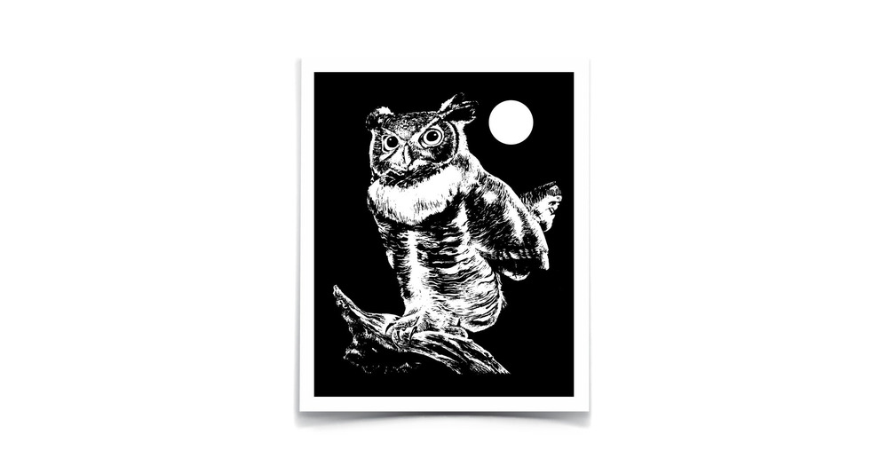 Great Horned Owl Art Print, Owl and moon Black and white, Christmas Gift, Bohemian Art
