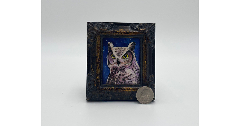 Great Horned Owl Framed Miniature Watercolor Art Print by James Steeno Mini Art, Small Art, Tiny Art