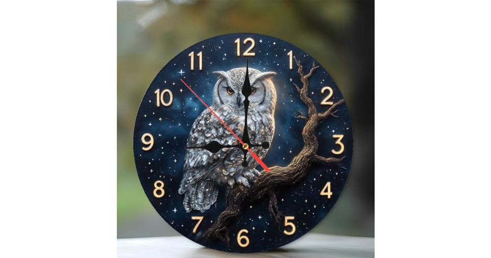 Handpainted Owl Clock Night Sky Decor Wall Clock 10-Inch Wooden Wall Clock, Silent Movement, Perfect