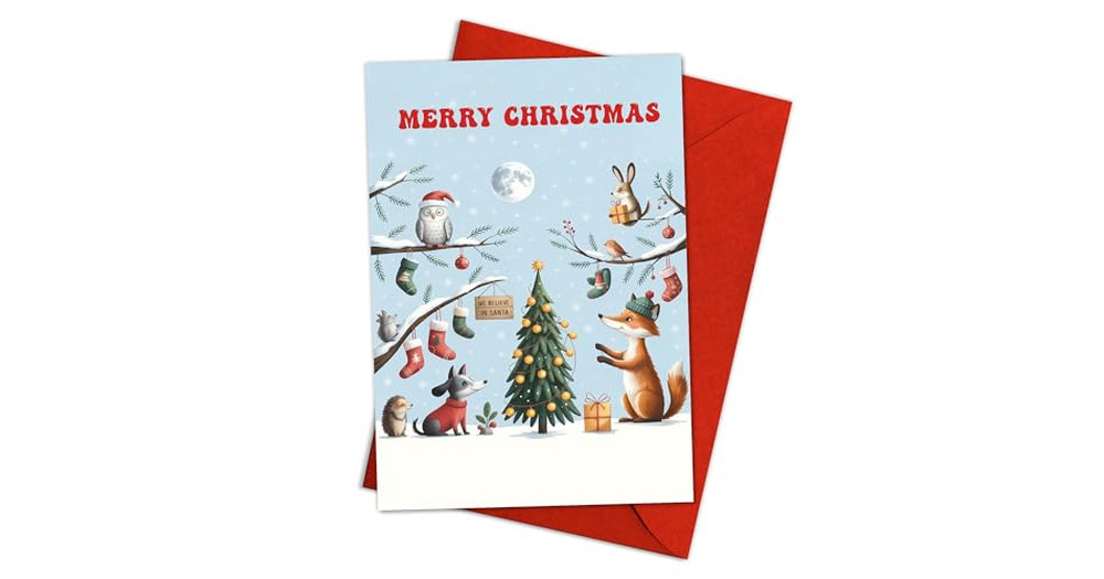 (5.3x8in) Merry Christmas Greeting Card with Woodland Animals Illustration, Cute Winter Forest Scene