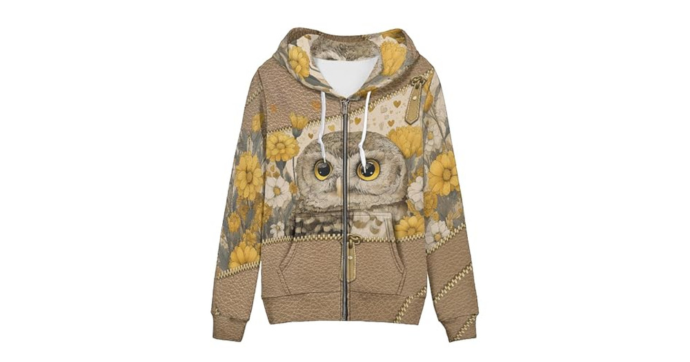 Pinupub Brown Funny Owl Hoodie Women Soft Comfy Fall Long Sleeve Zip Up Hoodies Casual Spring Graphi