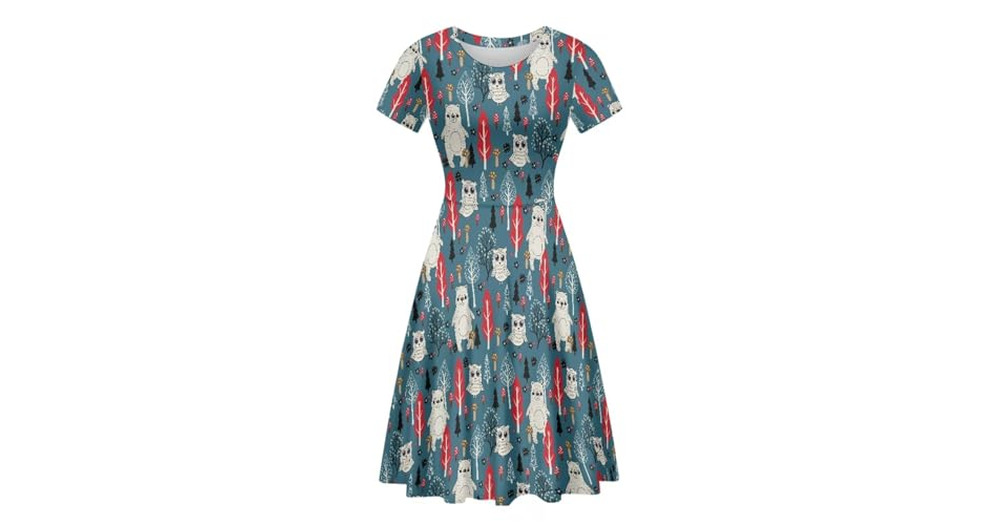 Beauty Collector Forest Bear Owl Mushroom Women Cute Dresses Crewneck Short Sleeve A-Line Midi Dress
