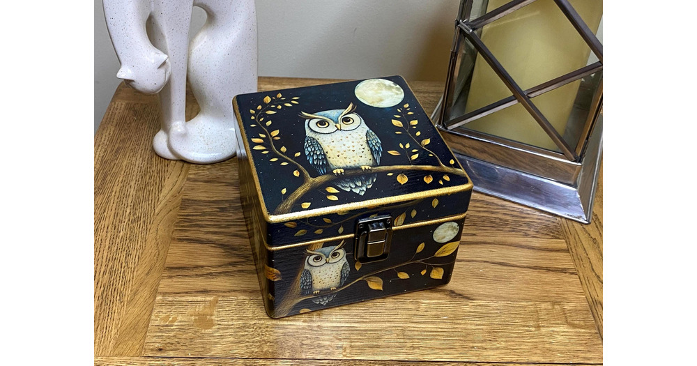 Hand decorated wooden box in decoupage style. Owl and moon design in black, white and gold.