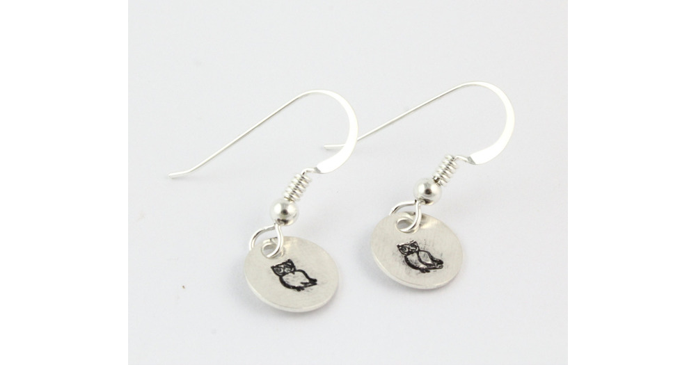 Handstamped Owl Earrings - Sterling Silver Hoot Owl Dangle Earrings