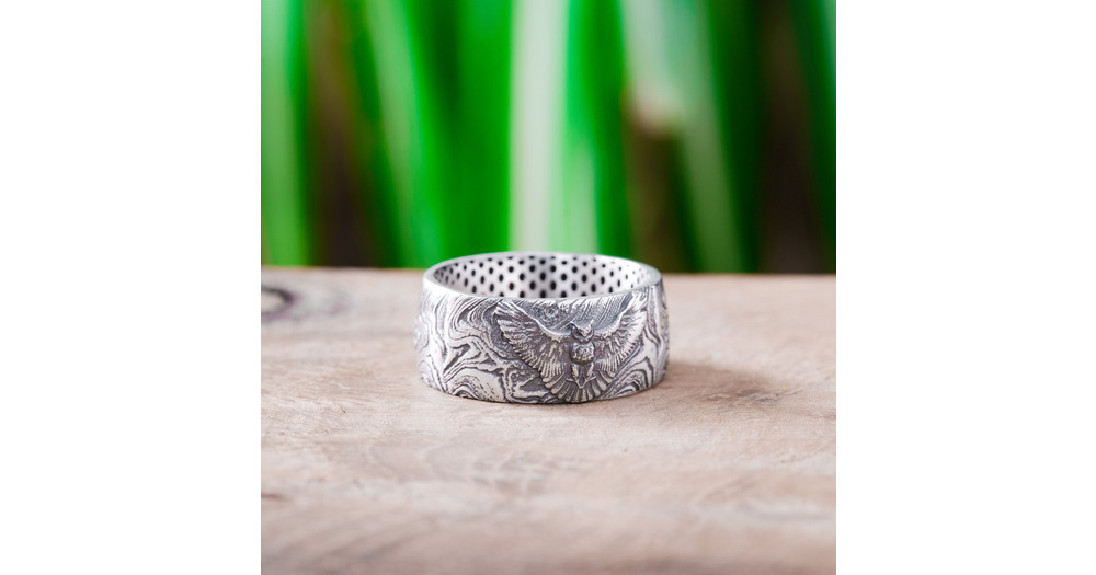Silver Owl Ring For Men Damascus Pattern Sterling Band, Vintage Style Gothic Ring, Cool Husband Jewe