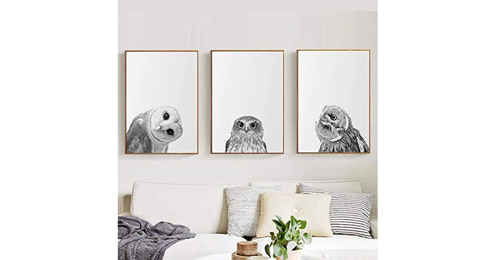 Canvas Wall Art for Nursery - Black and White Owl Picture - Funny Animal Canvas Prints - 16x24inchx3