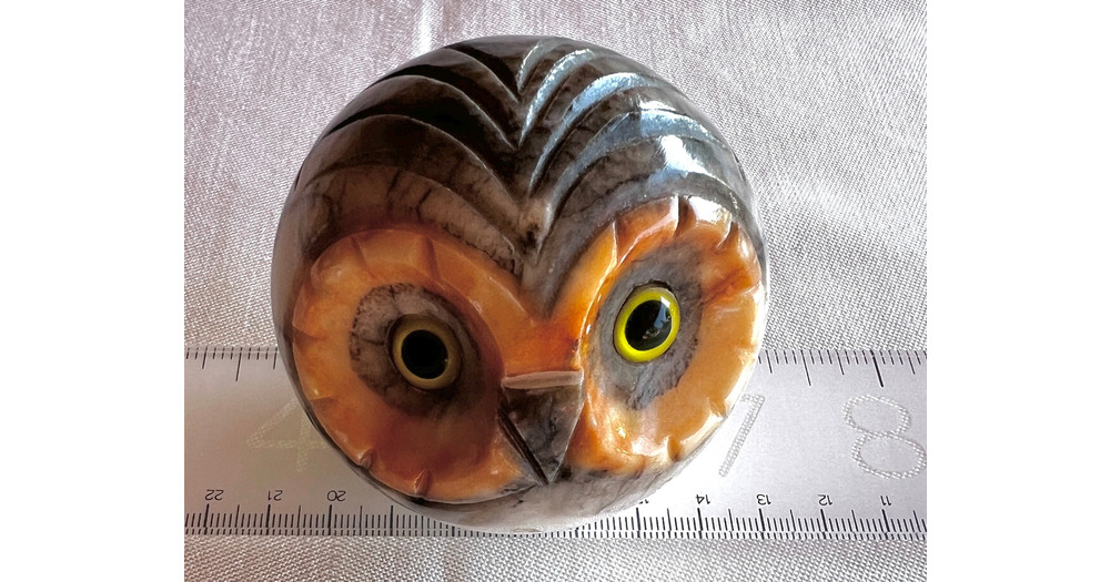 Noymer Alabaster Carved Owl Paperweight w Original Foil Label Made in Italy 2" tall Handmade