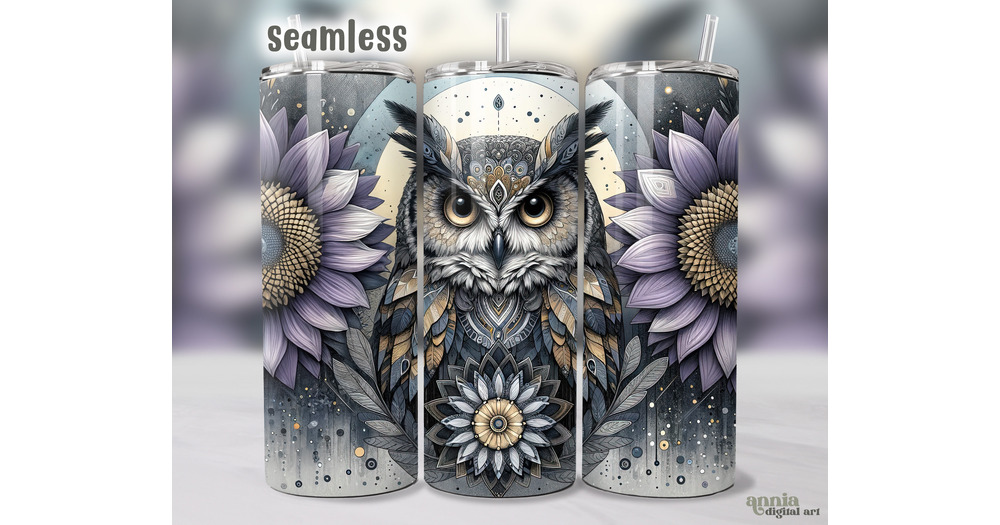 Sunflower Owl Tumbler Wrap, Boho Celestial 20oz Skinny Tumbler Sublimation Design, Seamless Witchy S