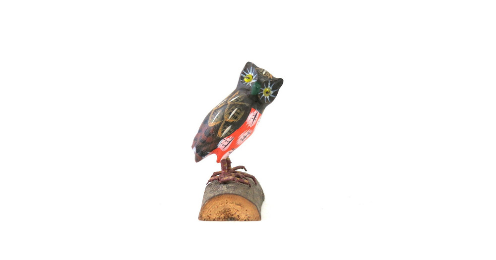 Vintage Hand Carved Wood Owl - Painted Bird on Log Statue