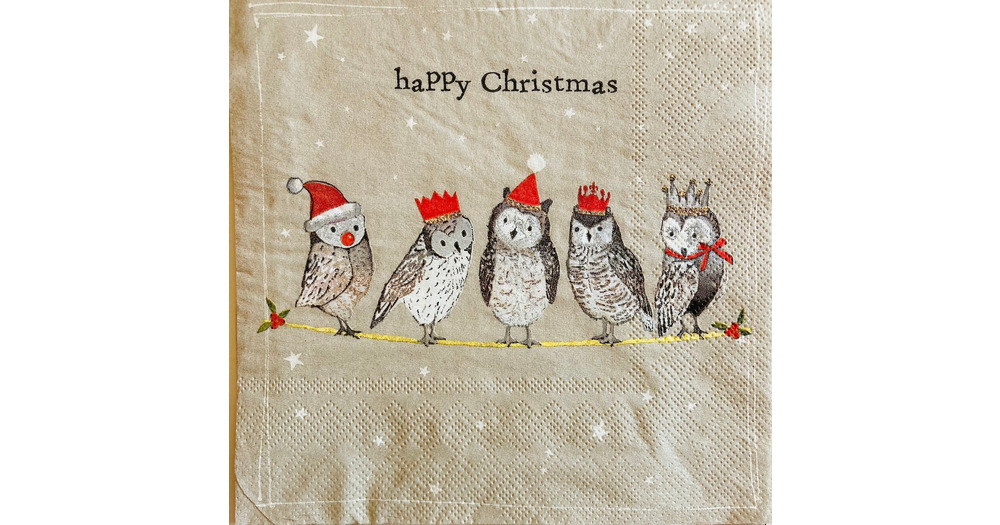 3 Decoupage Lunch Napkins, Happy Christmas Owls 13" x 13" Unfolded