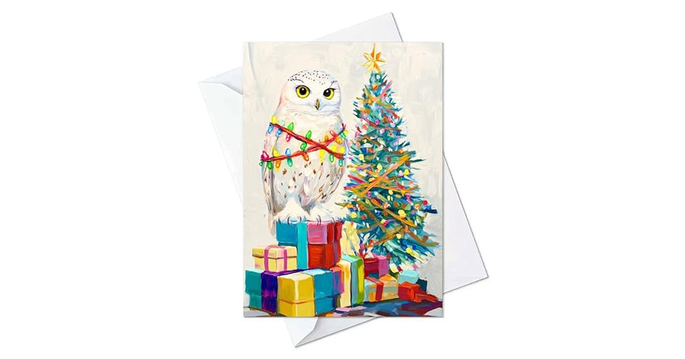 Snowy Owl Tangled in Christmas Lights Greeting Cards - Cards with Envelopes - (Set of 10) Large 5.8