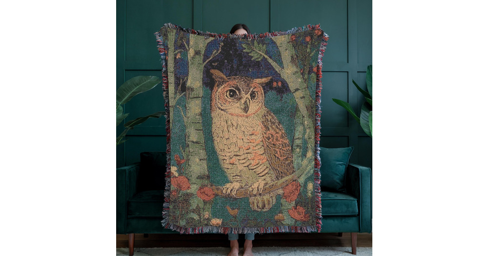 Woodland Owl Woven Throw, 100% Cotton Whimsigoth Blanket, Mystical Forest Tapestry, Gothic Nature Gi