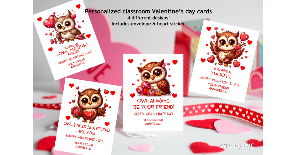 PRINTED Personalized Owl Classroom Valentine's Day Cards, Valentine's Day Cards, Owl Valenti