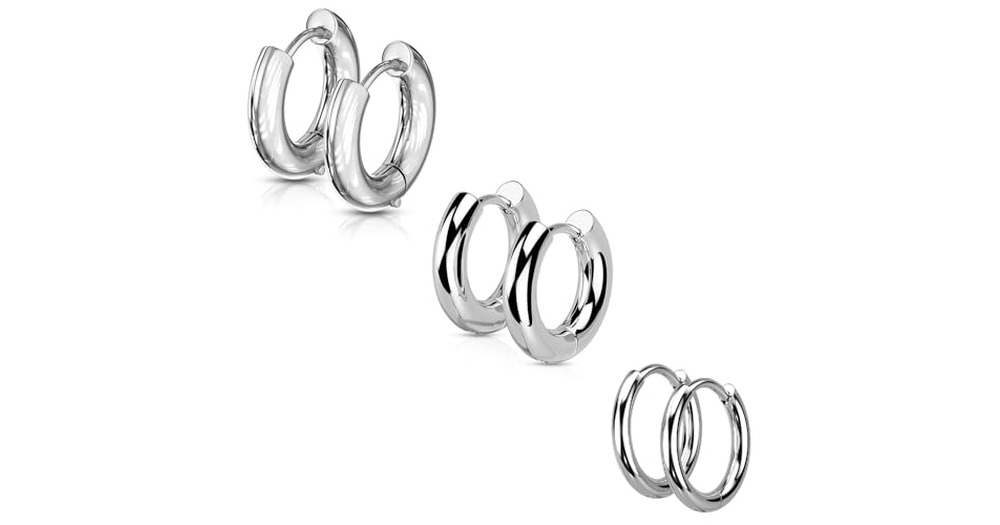 Set of 3 Pairs 316L Stainless Steel Classic Round Hinged Huggie Hoop Earrings (Silver Tone)
