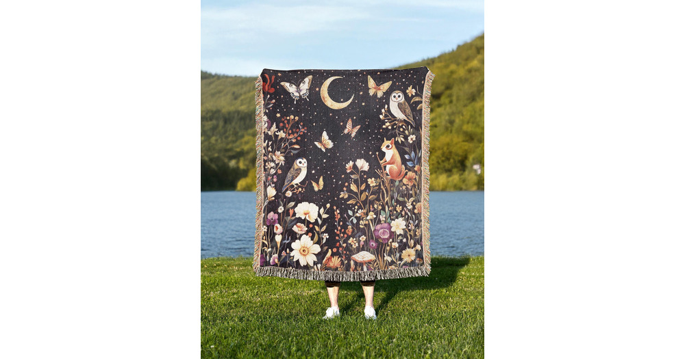 Forest Animals Woven Blanket, Woodland Cottagecore Owl Decor, Floral Butterfly Housewarming Gift for