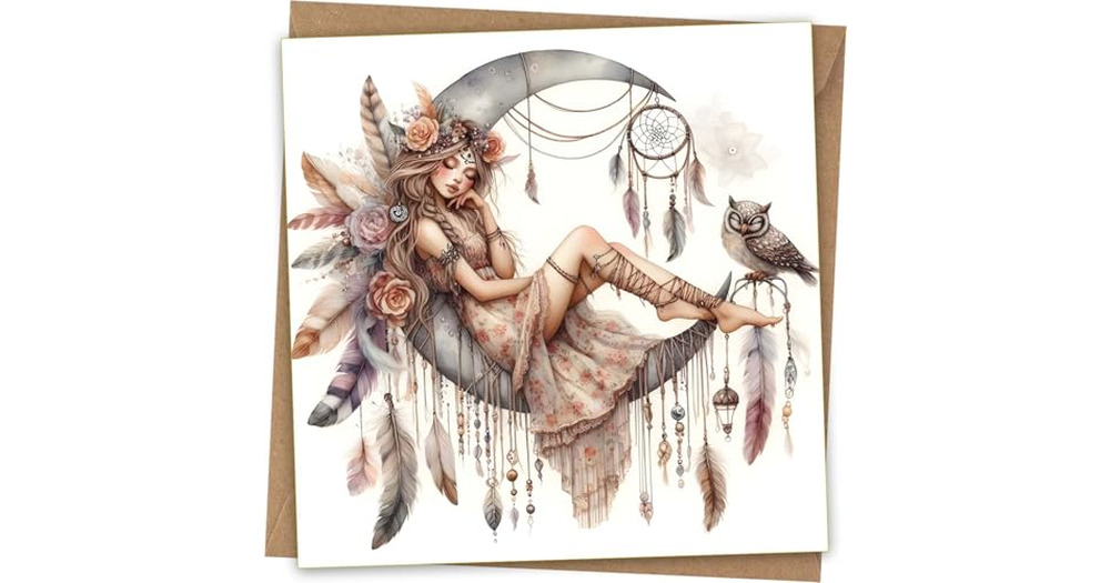 Tribal Girl & Moon Greeting Card - Cute Owl Dream Catcher Crescent Moon Birthday Card for Daught