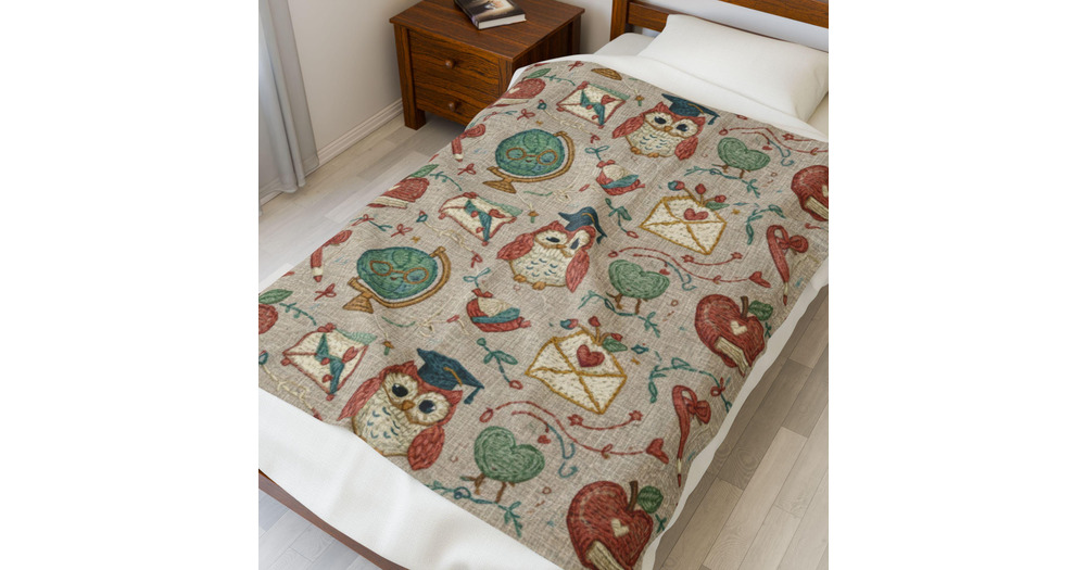 School Owl Pattern Velveteen Plush Blanket | Teacher Classroom Graduation Throw