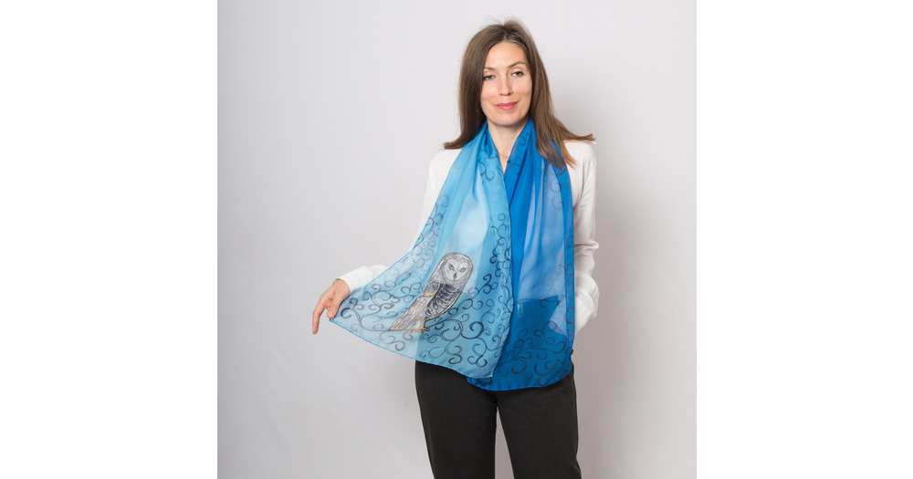 Owl Hand Painted Silk Chiffon Scarf Bird Print Blue Shawl Owl Gift 57X16