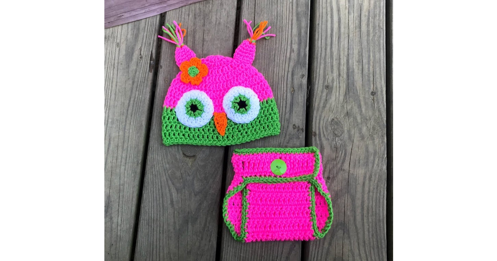 Crochet Owl Beanie and Diaper Cover Set: Pink & Green, Newborn Photo Prop