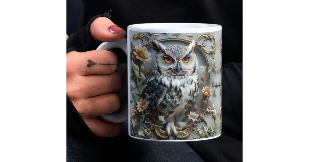 Floral Owl Mug Wrap, 3D White and Grey Owl 11oz & 15oz Mug Sublimation Design, Instant Download