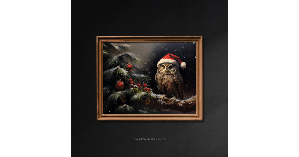 Christmas Antique Dark Owl Painting, Winter Christmas Tree, Seasonal Holiday Decor, Vintage Rustic P