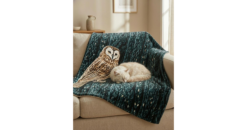 Barn Owl Illustration Sherpa Fleece Blanket | Dark Teal Cable Knit Velveteen Throw