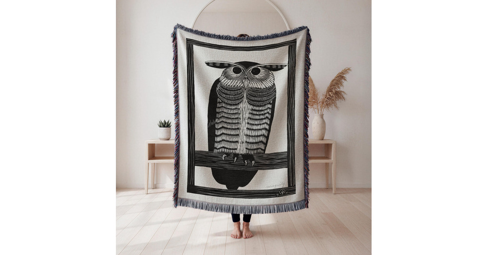 Owl Perched Woven Blanket, graphic black and white nature art tapestry throw, rustic wildlife wall d