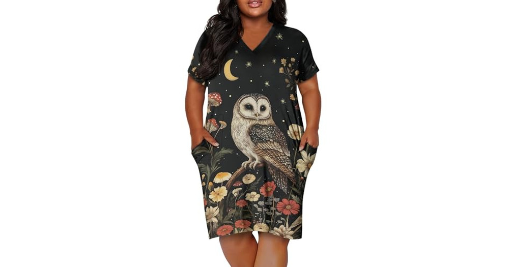 Pinupub Black Retro Floral Owl Dresses for Women Casual Plus Size Short Sleeve Tshirt Dress with Poc