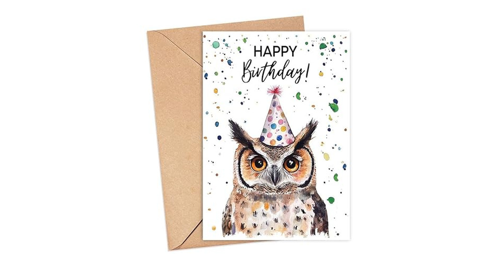 HKDesignGift Owl Birthday Card With Party Hat - Happy Birthday Card - Owl Gift - Zoo Safari Animal B