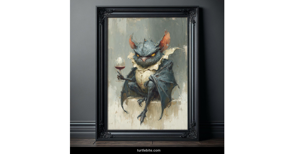 Bat Owl Hybrid Print, Gothic Art, Dark Humor Poster, Grumpy Creature with Wine Glass, Whimsigoth Moo