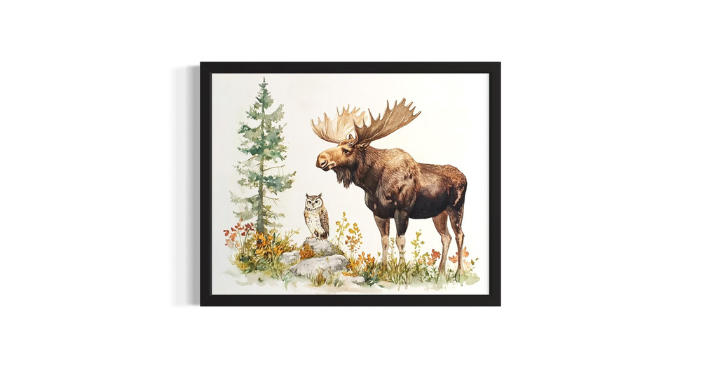 Moose and Owl Animal in Harmony Forest Wildlife Poster Art Print, Living Room Wall Art Poster, Origi