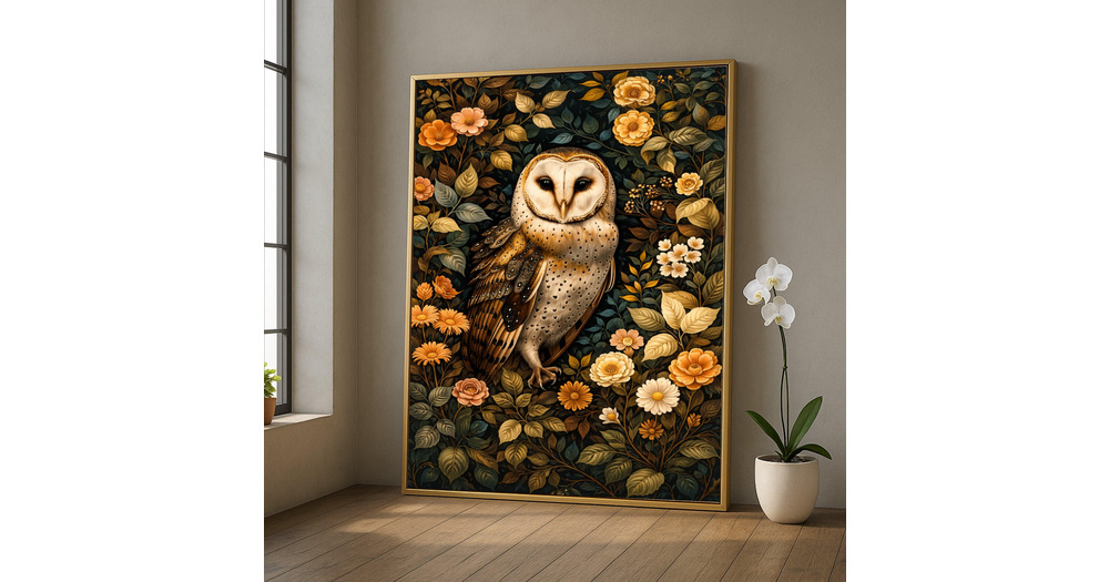 William Morris Owl Canvas Wall Art, Detailed Barn Owl and Floral Botanical Canvas, Elegant Nature Wi