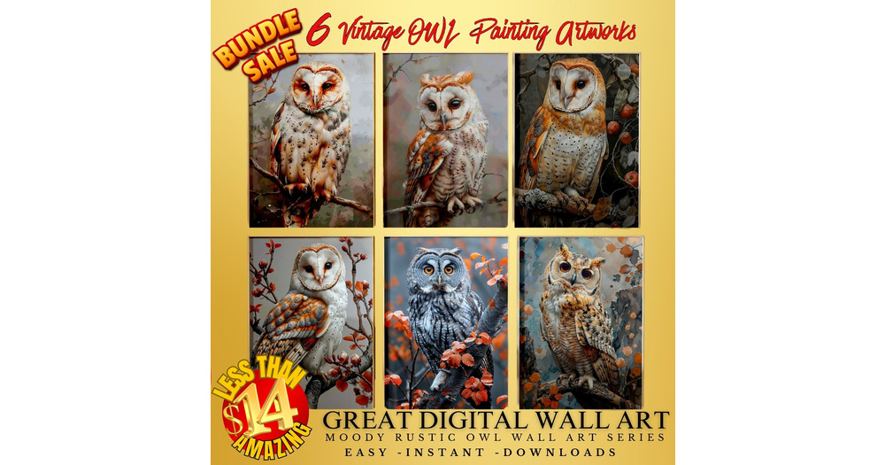 6 Vintage Owl Painting Artwork BUNDLE of 6 Moody Rustic Owl Wall Art, Digital Download, Cottagecore