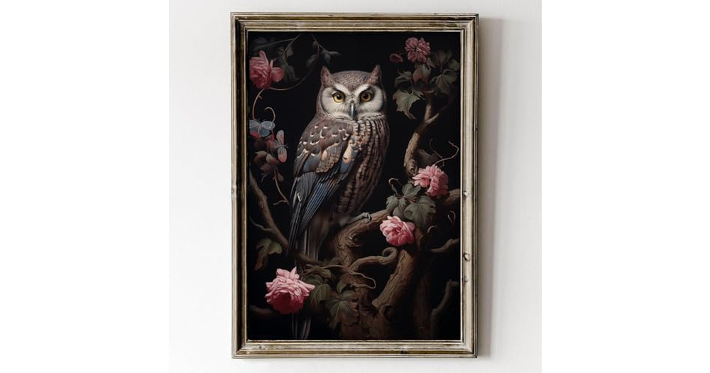 Vintage Owl Wall Art Dark Academia Floral Print Poster Black Gothic Owl Painting Vintage Gothic Flor