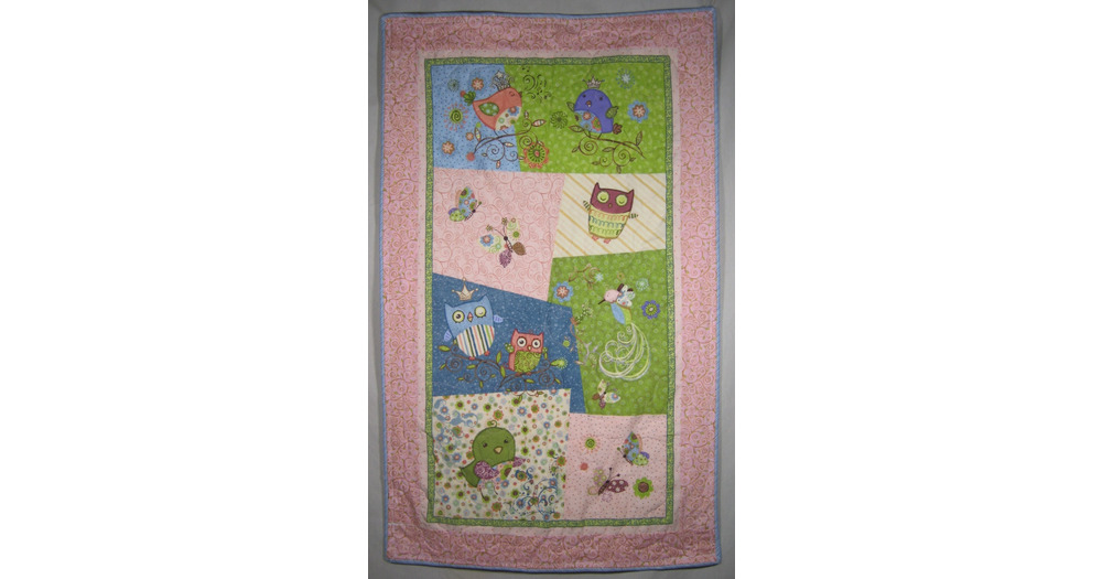 Birds and Owls Panel Quilt, Pink, blue and green.