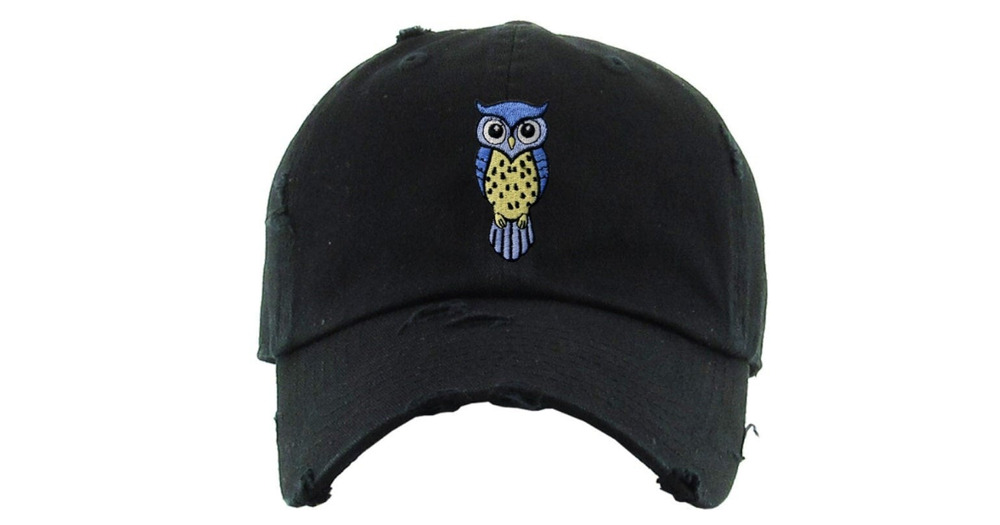 Black Distressed Cap with Cute Blue and Yellow Owl - Owl Unisex Hat