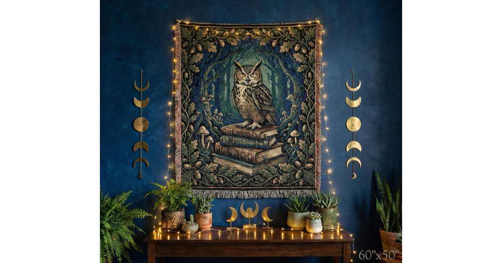 Dark Academia Woven Blanket Owl on Books Throw, Mystical Library Decor, Cottagecore Tapestry, Book L