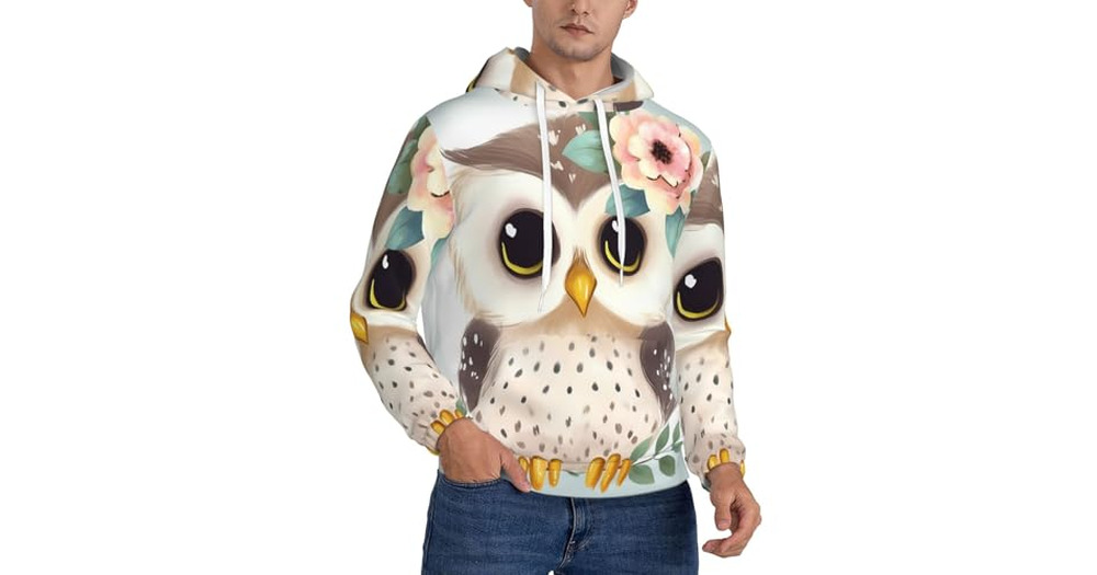 FHEBNDS Men's Fleece-Lined Hoodie Pullover Cute Owl with Flowers Hoodies Casual Winter Hooded S