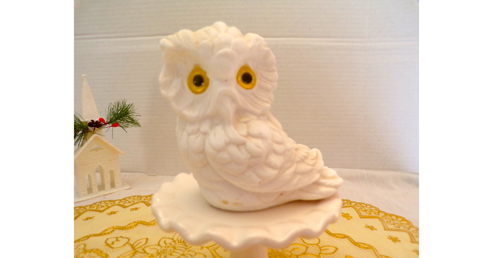 White Alabaster Sandstone Horned Owl/Bird with Yellow Glass Eyes Hand Carved Italy